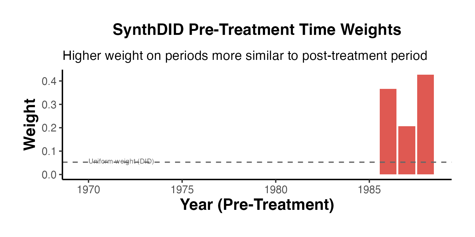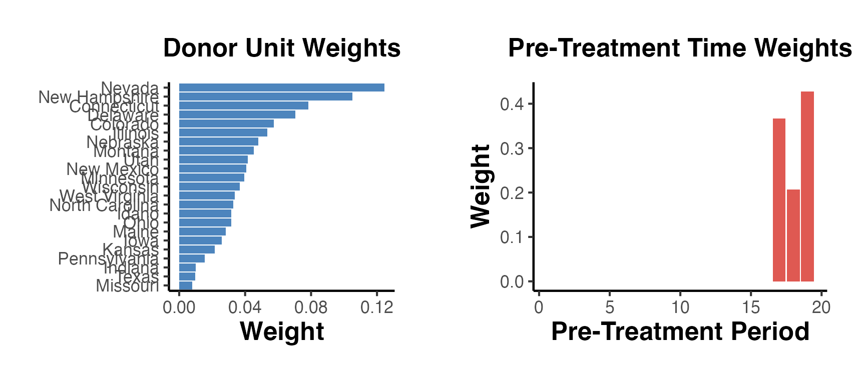These time weights focus the comparison on pre-treatment periods that are most informative for predicting post-treatment outcomes among control units. Periods that are more similar to post-treatment periods receive higher weight.