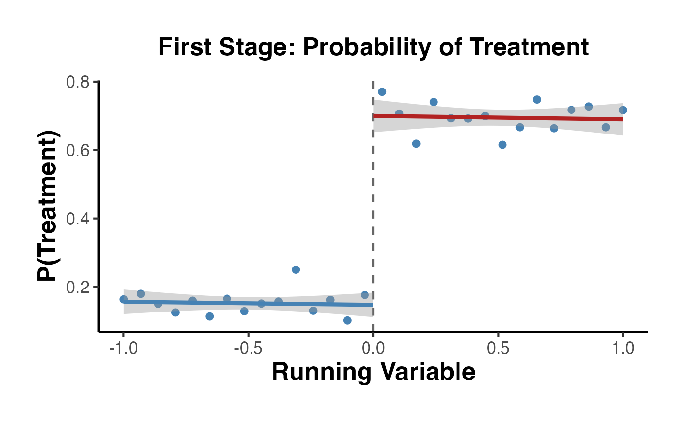 ggplot2::labs(title = "First Stage", x = "Running Variable", y = "P(Treated)") +