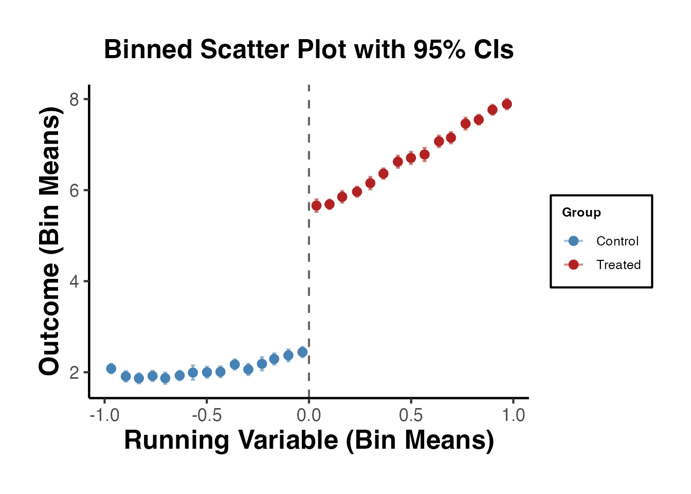 With many observations, a binned scatter plot is more informative. We divide the running variable into equal-width bins and plot the mean outcome within each bin.