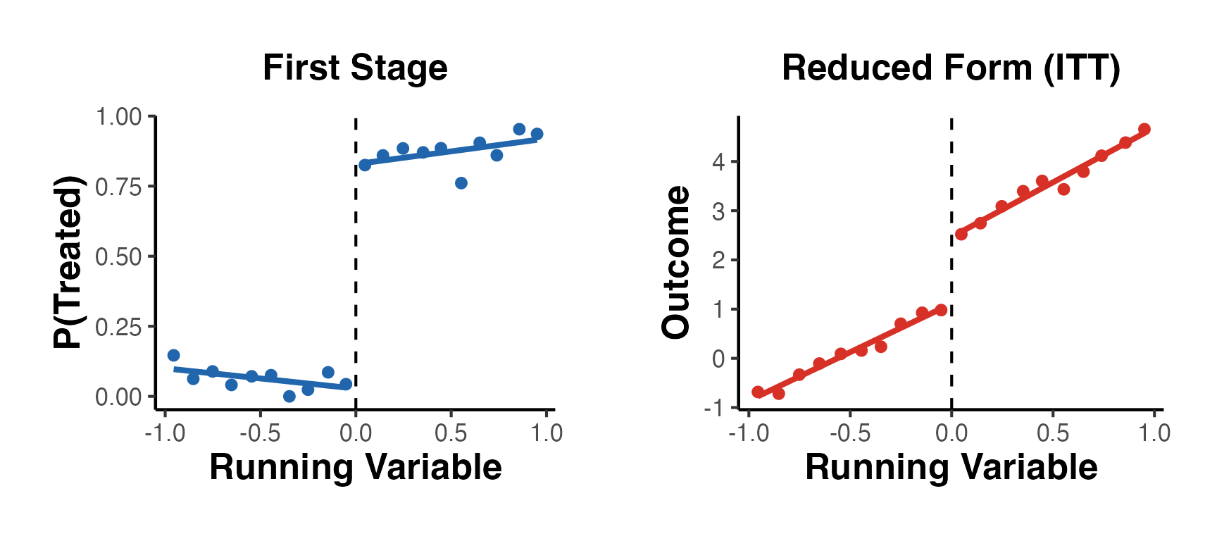 ggplot2::labs(title = "Reduced Form (ITT)", x = "Running Variable", y = "Outcome") +