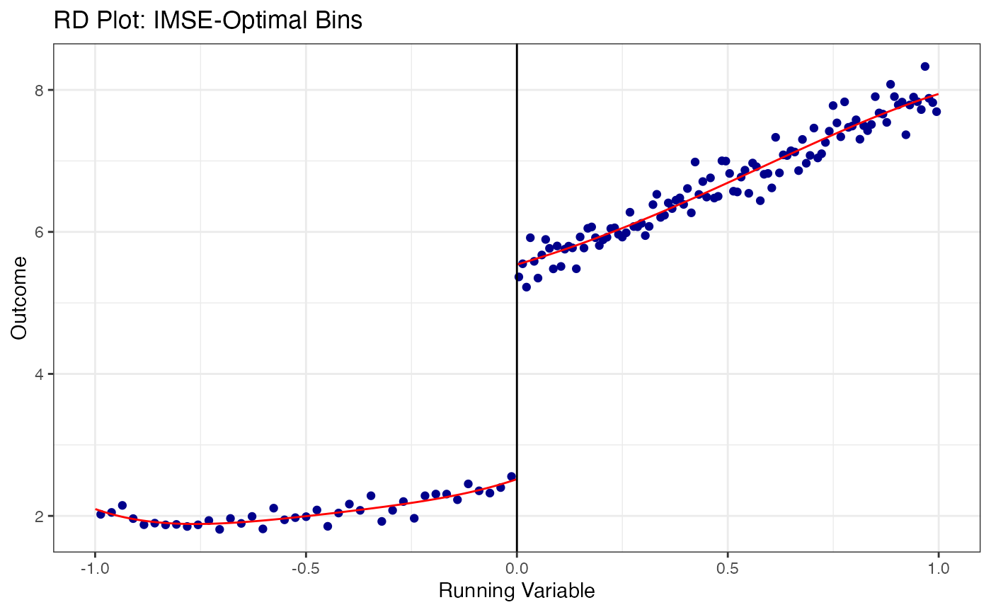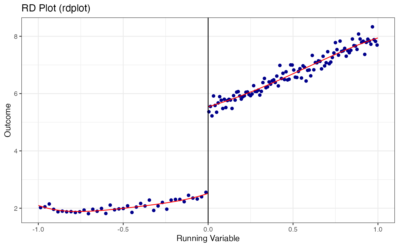 #> Fuzzy RD: First stage jump ~ 0.543Visualization is the first and most important step in any RD analysis. Before estimating anything, the researcher should inspect the data graphically.