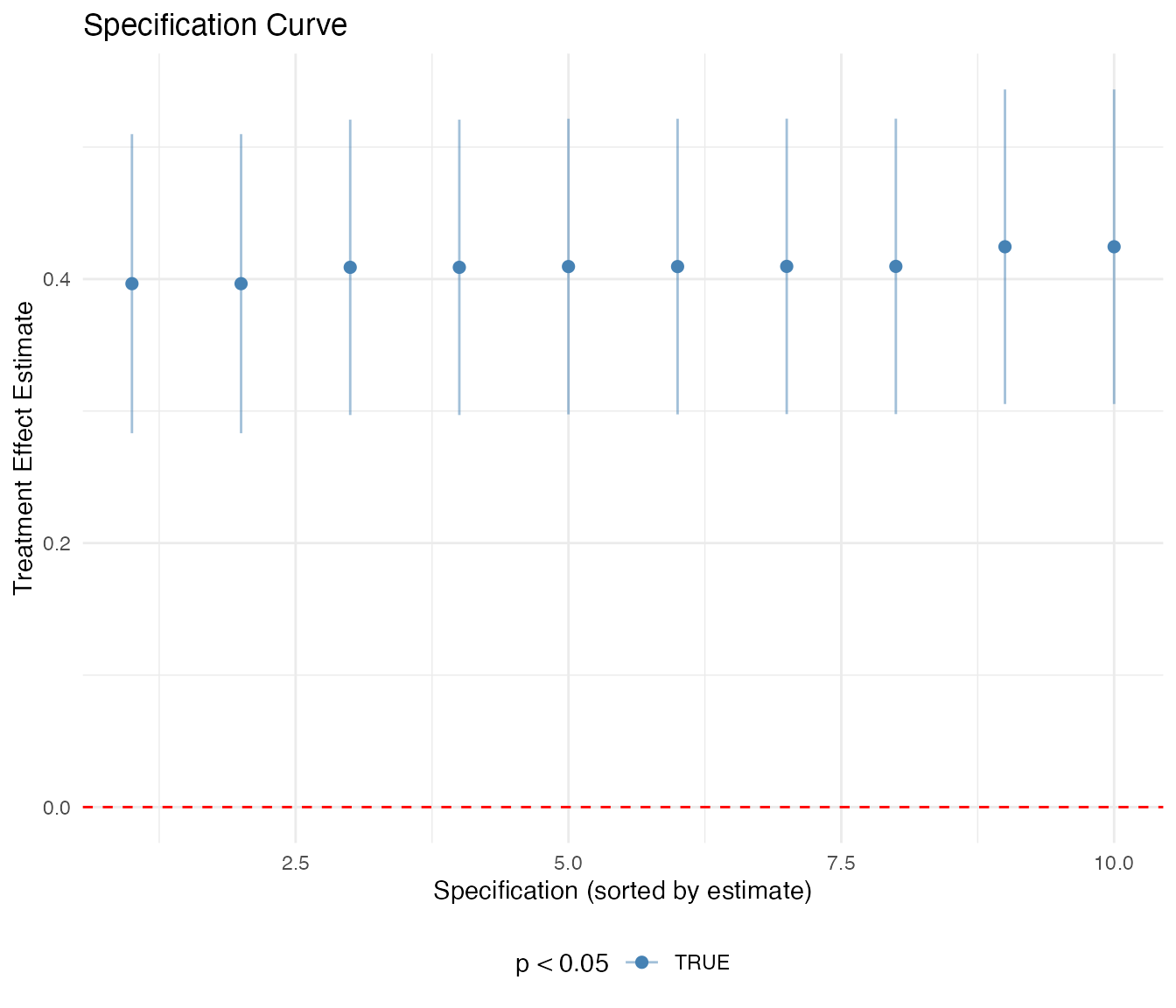 summary(sens)The summary reports the estimated treatment effect, the robustness value , the robustness value for statistical significance , and benchmark comparisons. If , it means a confounder would need to explain at least 15% of the residual variance of both treatment and outcome to bring the effect to zero.