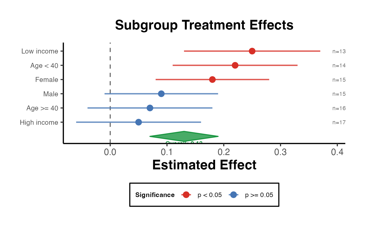 Creates a publication-ready forest plot visualising treatment effect heterogeneity across subgroups or conditional average treatment effects (CATE). Confidence intervals are shown as horizontal whiskers, the point estimate as a filled dot colour-coded by statistical significance, and an optional overall-effect diamond is drawn at the bottom.
