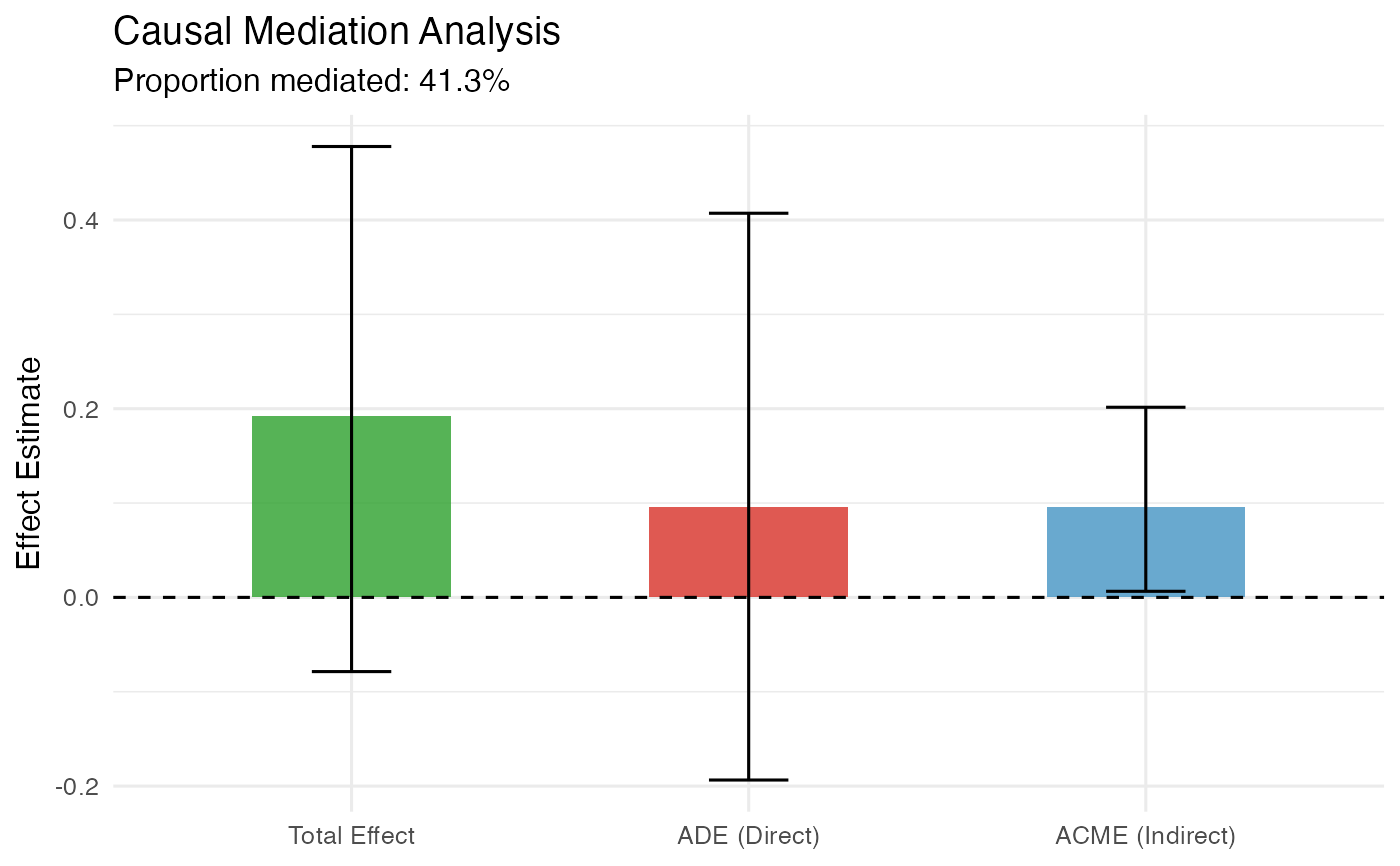 mediation_analysis.RdPerforms causal mediation analysis to decompose the total treatment effect into the Average Causal Mediation Effect (ACME / indirect effect) and the Average Direct Effect (ADE). Wraps mediation package functionality with enhanced output and visualization.