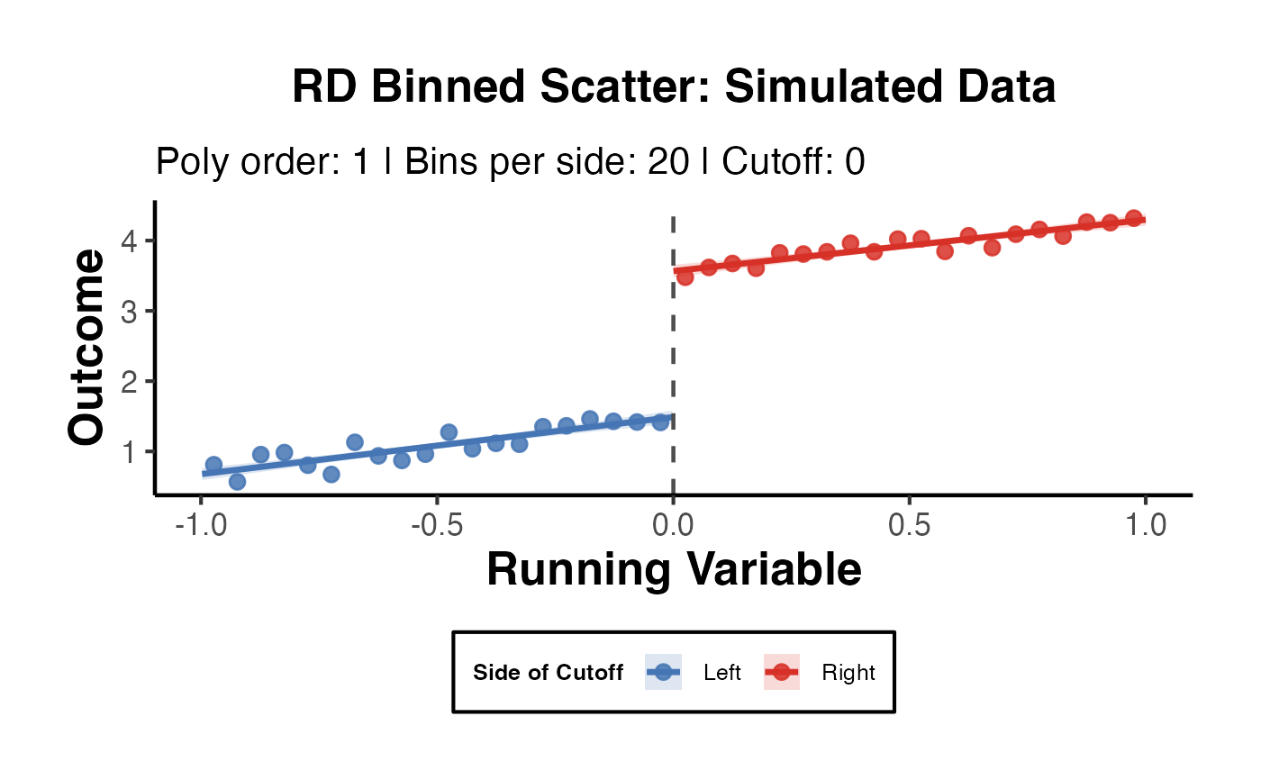 rd_binscatter.RdProduces a publication-ready RD plot that clearly visualises the discontinuity at the cutoff by displaying bin means and a polynomial fit on each side, with an optional confidence ribbon.