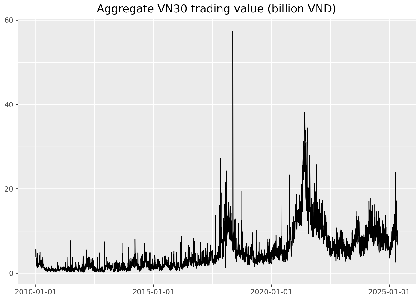 + labs(title="Aggregate VN30 trading value (billion VND)", x="", y="")