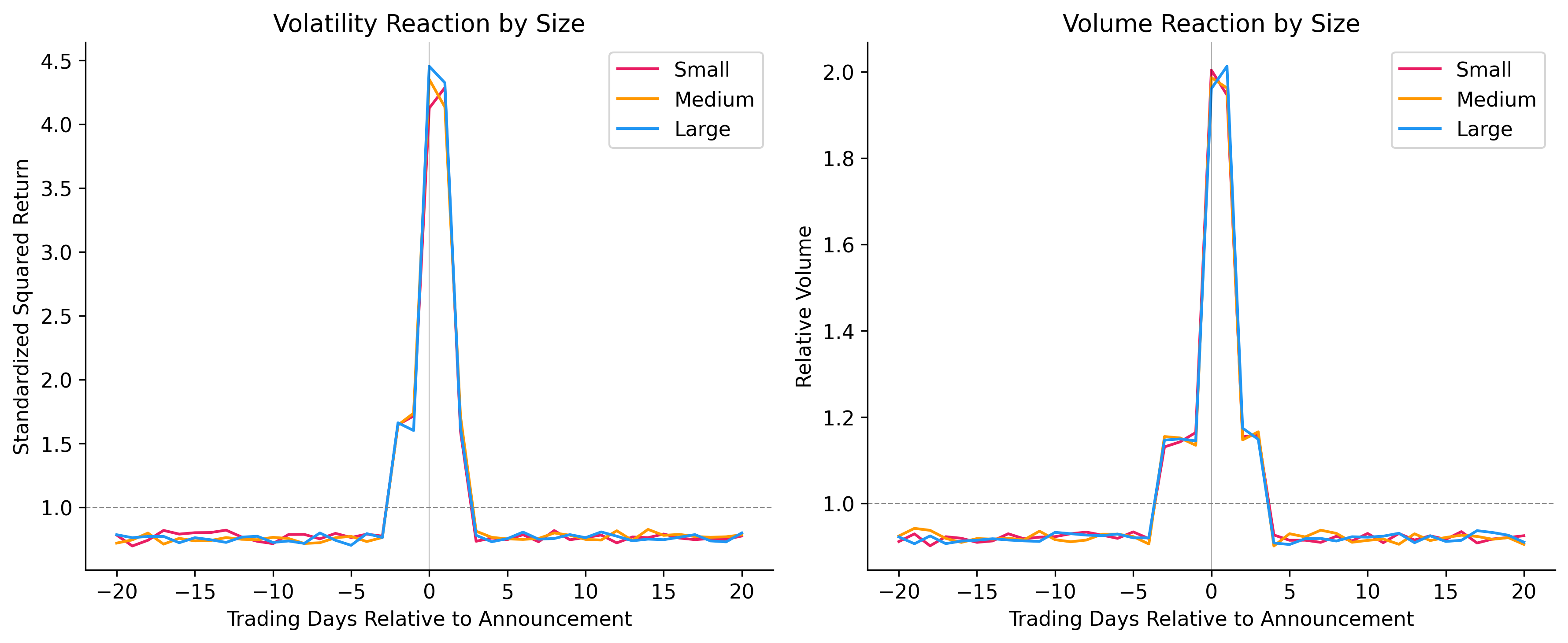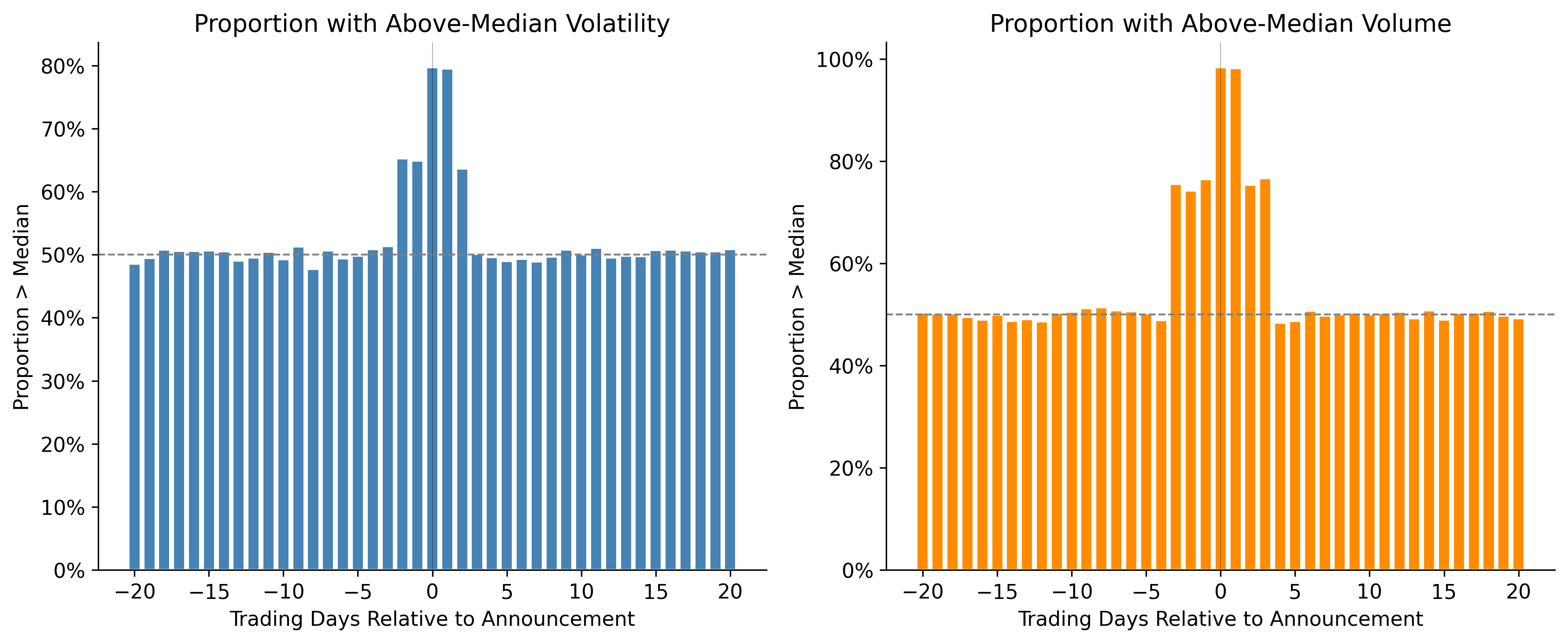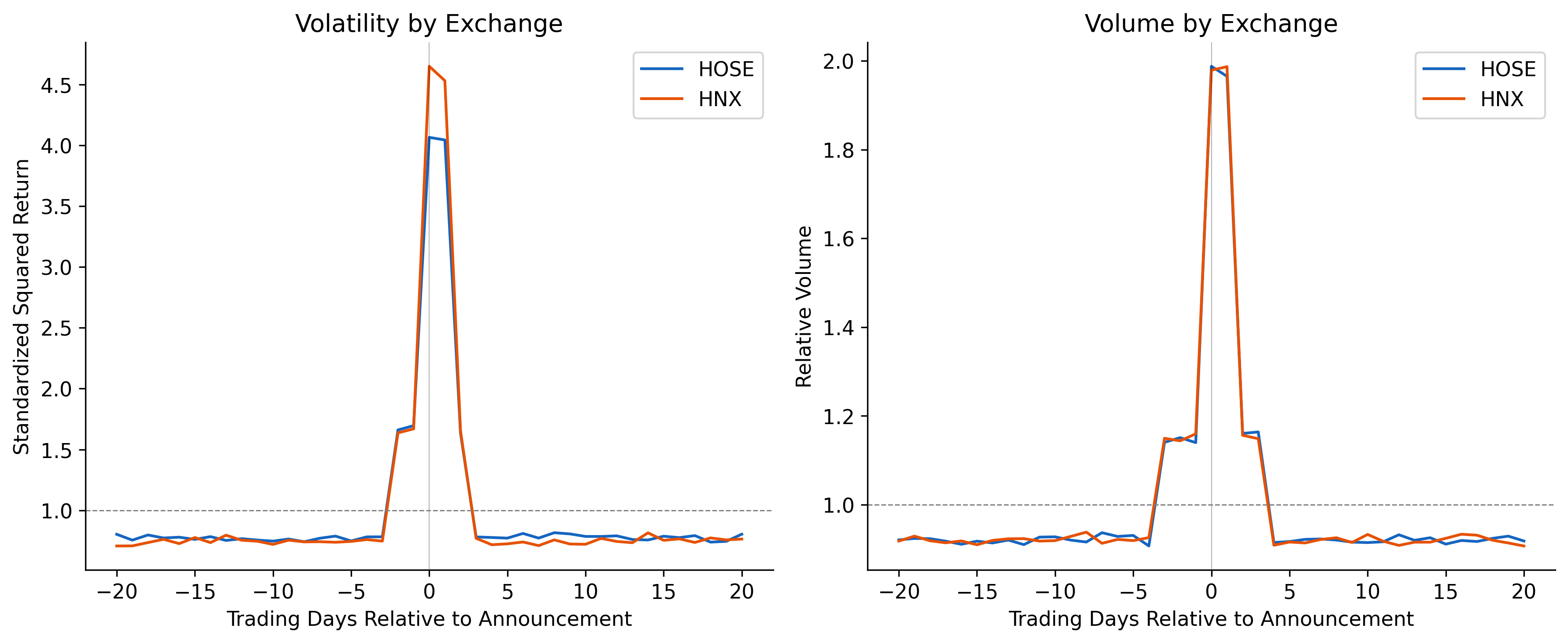 This distinction matters for Vietnam. In a market dominated by retail investors with heterogeneous information and analytical capacity, we might expect the volume reaction to be disproportionately large relative to the price reaction, because disagreement is high even when the aggregate price revision is modest.