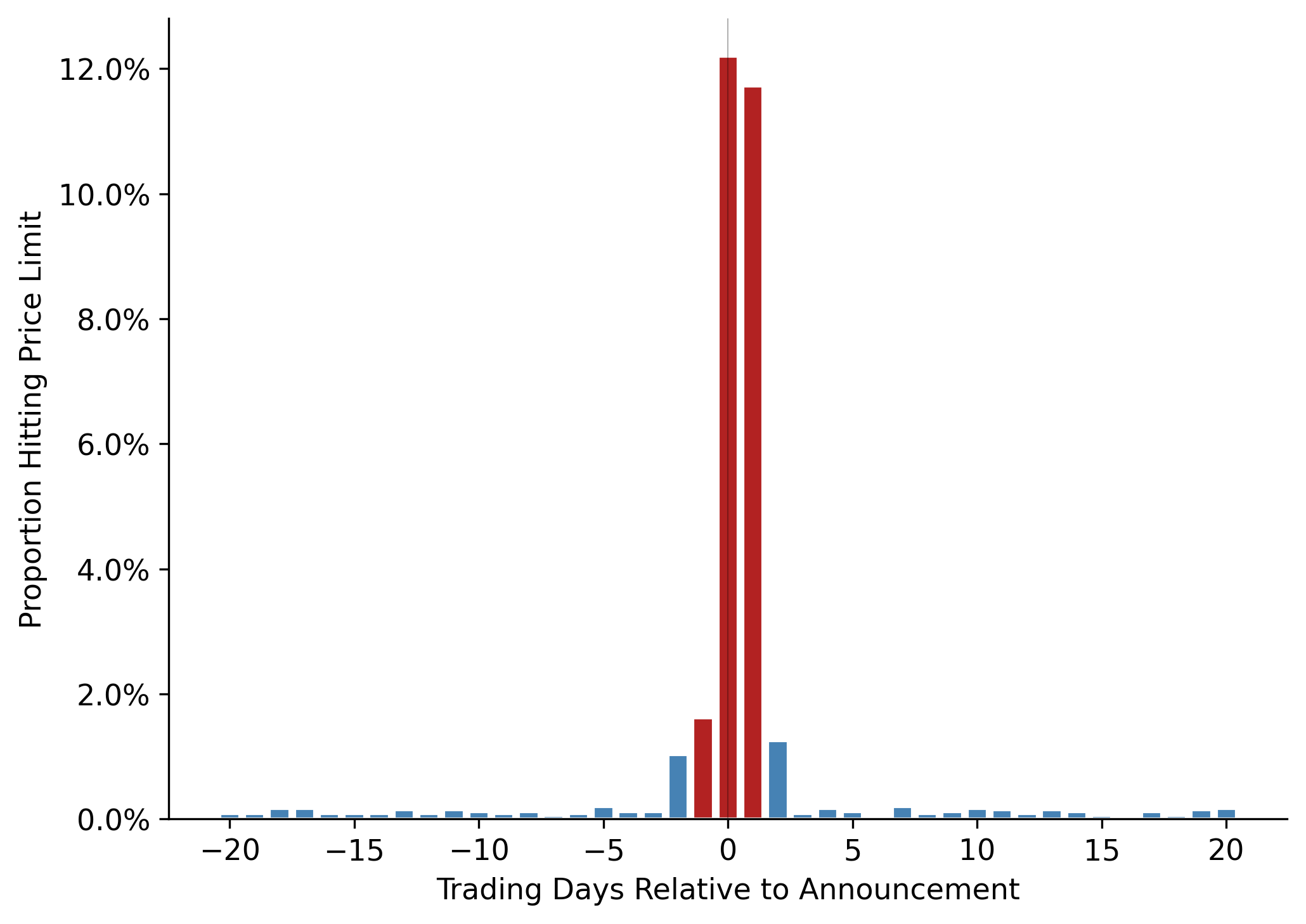 A distinctive feature of Vietnamese markets is that daily price limits can prevent full single-day price adjustment. When an announcement is sufficiently surprising, the stock may hit the \(\pm\) 7% limit on HOSE (or \(\pm\) 10% on HNX), and the remaining adjustment spills into subsequent trading days. This creates a pattern of limit hits followed by continued drift, a phenomenon that would bias downward any single-day measure of announcement impact and redistribute information content across days 0, +1, and potentially +2.