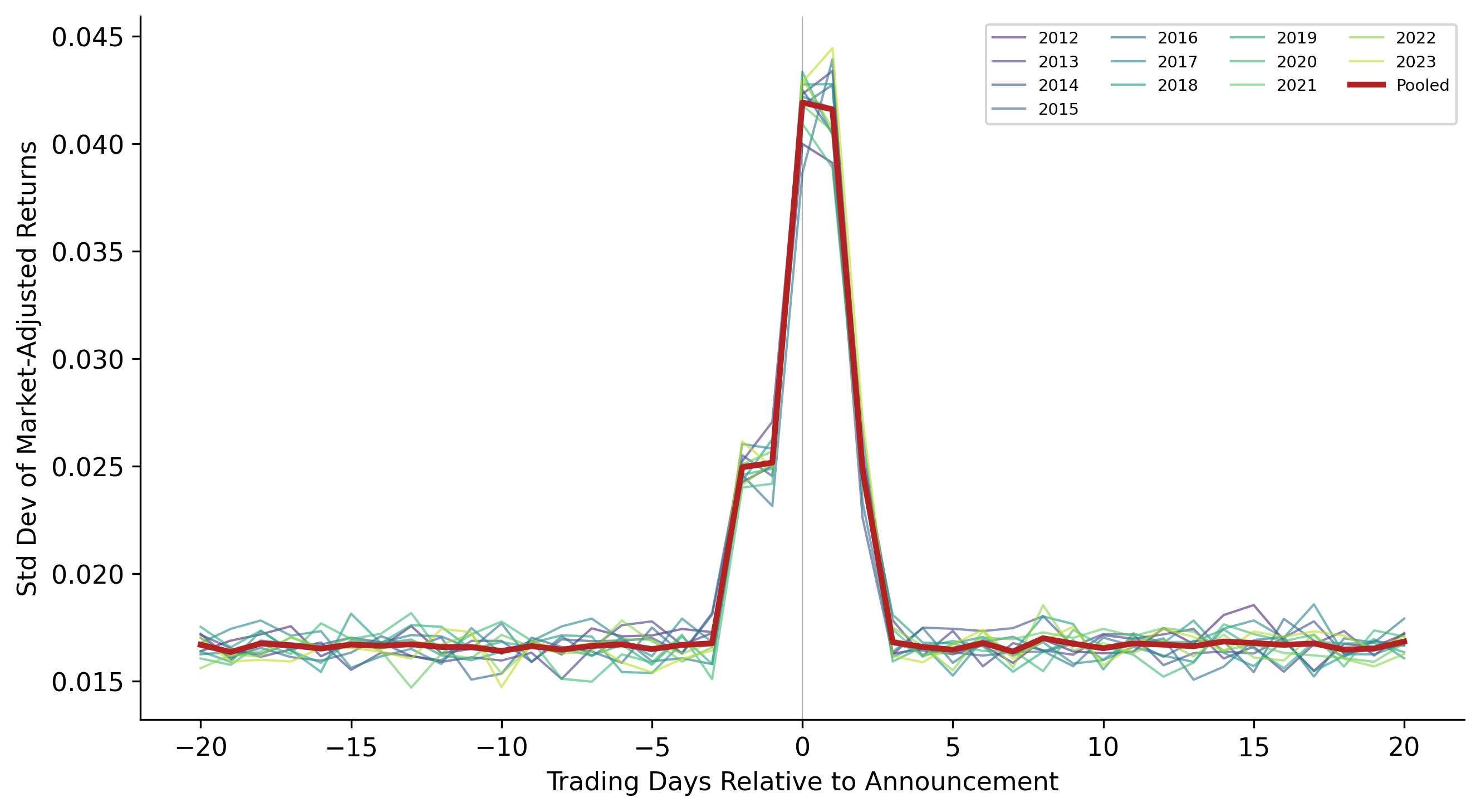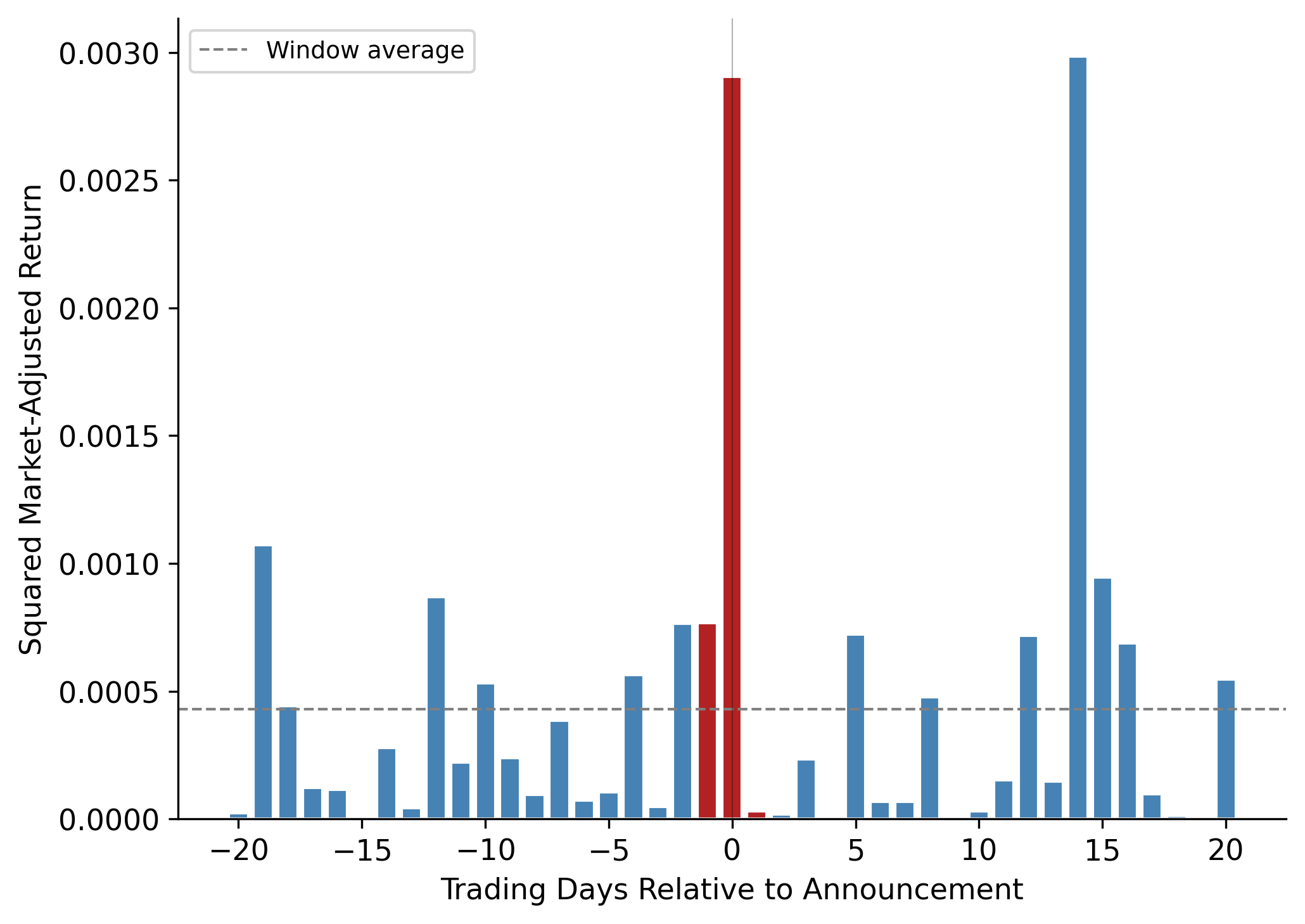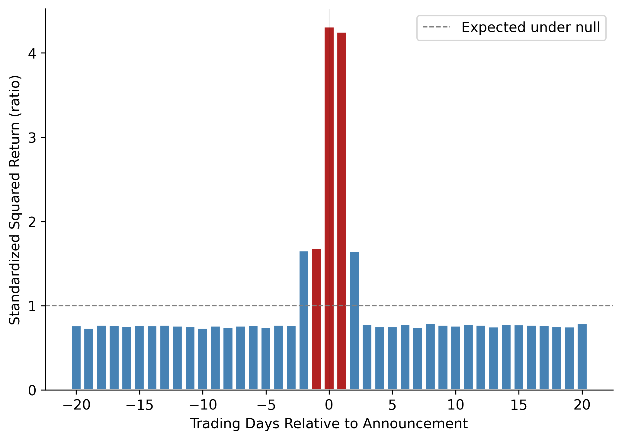 where \(R_{i,t}\) is the return on stock \(i\) and \(R_{m,t}\) is the market return. Under the null of no information content, \(E[U^2_{i,t}]\) should be the same in the announcement and non-announcement windows. Beaver (1968) standardized this measure by dividing by the firm’s average \(U^2\) during non-announcement weeks.