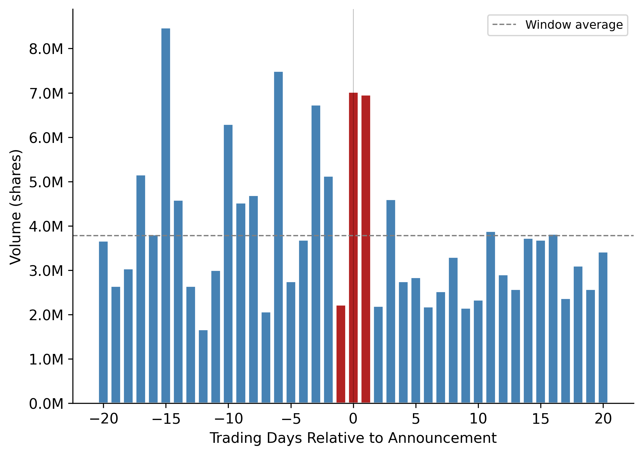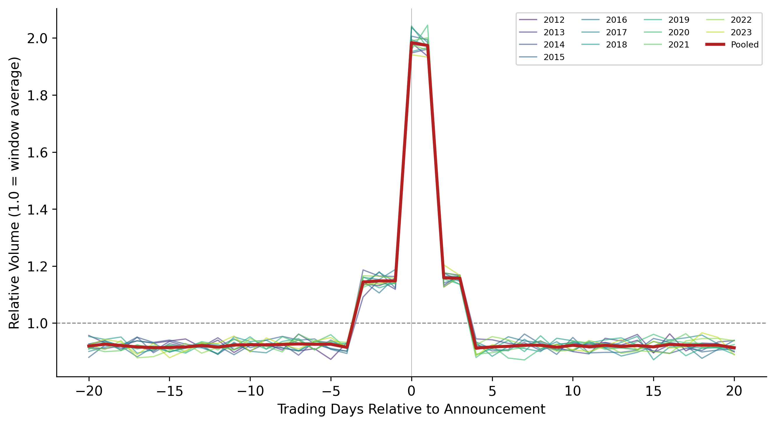 where \(\overline{Vol}_i\) is the firm’s average daily volume over the event window. A value of \(RV > 1\) indicates above-average trading. Beaver (1968) used a similar approach, computing a “volume ratio” relative to non-report-period averages.