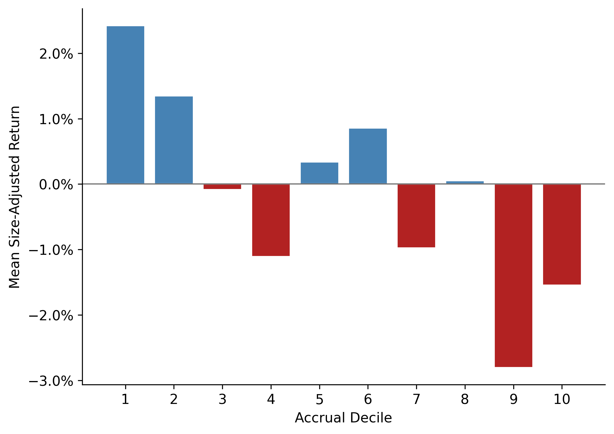 Following the portfolio approach of Sloan (1996), we compute mean size-adjusted returns for each accrual decile. If the market misprices accruals, we expect a monotonically decreasing pattern: low-accrual firms (decile 1) earn positive abnormal returns, while high-accrual firms (decile 10) earn negative abnormal returns.