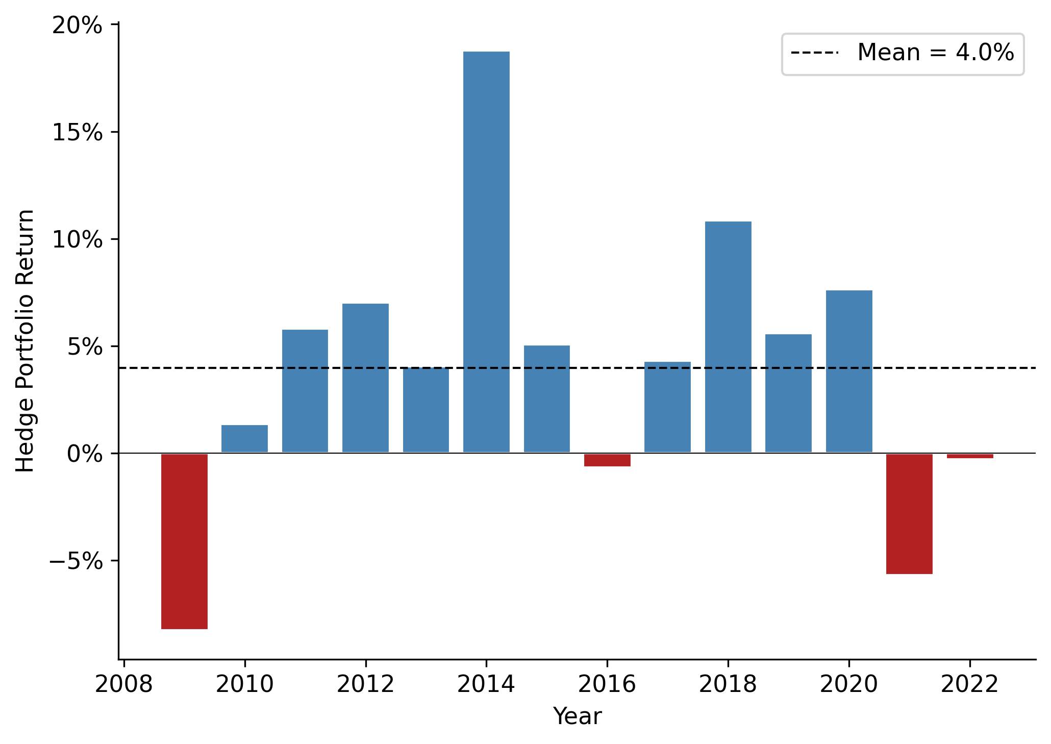 A critical question for any anomaly is whether it persists over time or is concentrated in specific sub-periods. Figure 26.5 plots the hedge portfolio return by year.