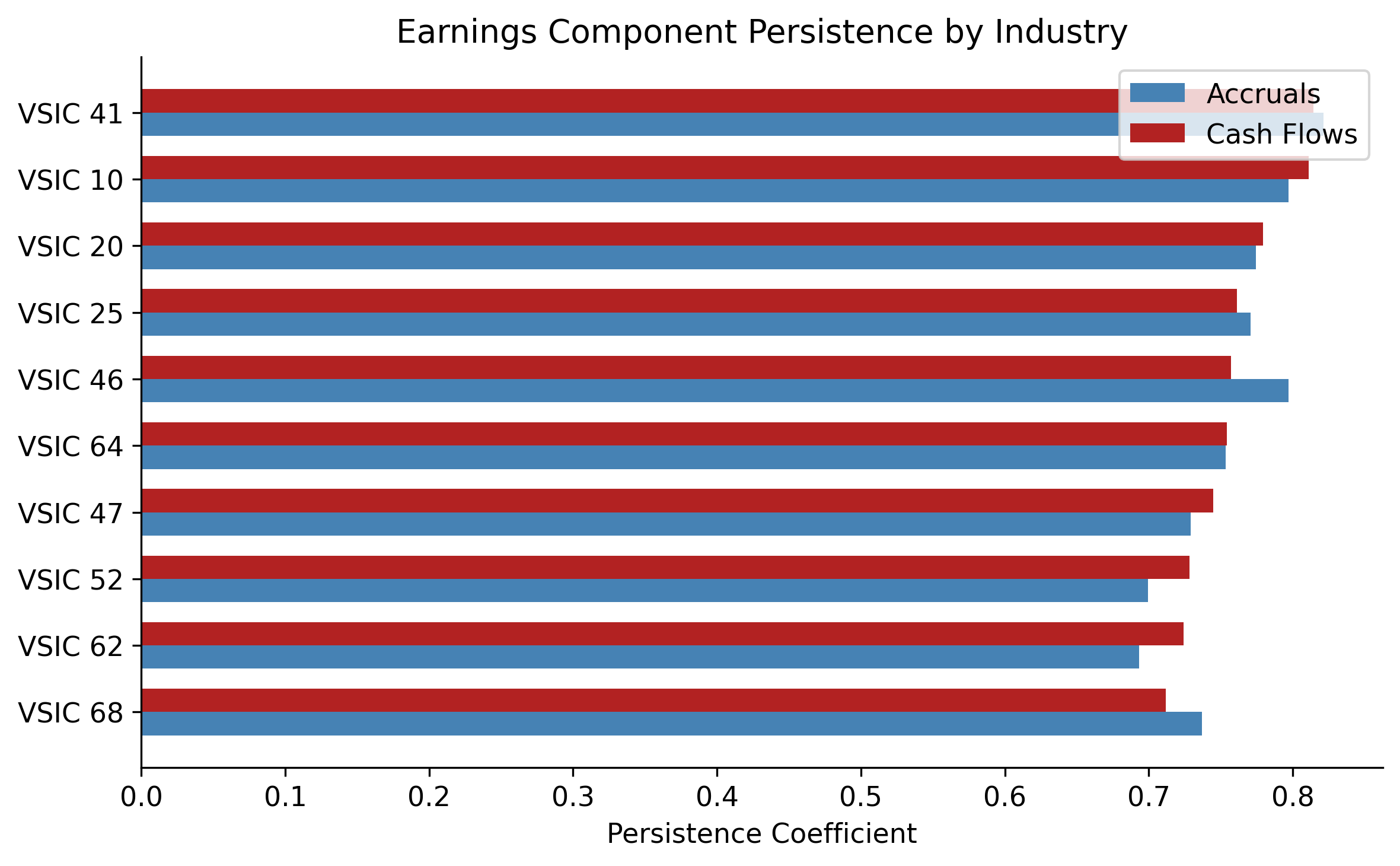 - Persistence regressions confirm that the accrual component of earnings is less persistent than the cash flow component, a finding that holds across industries.