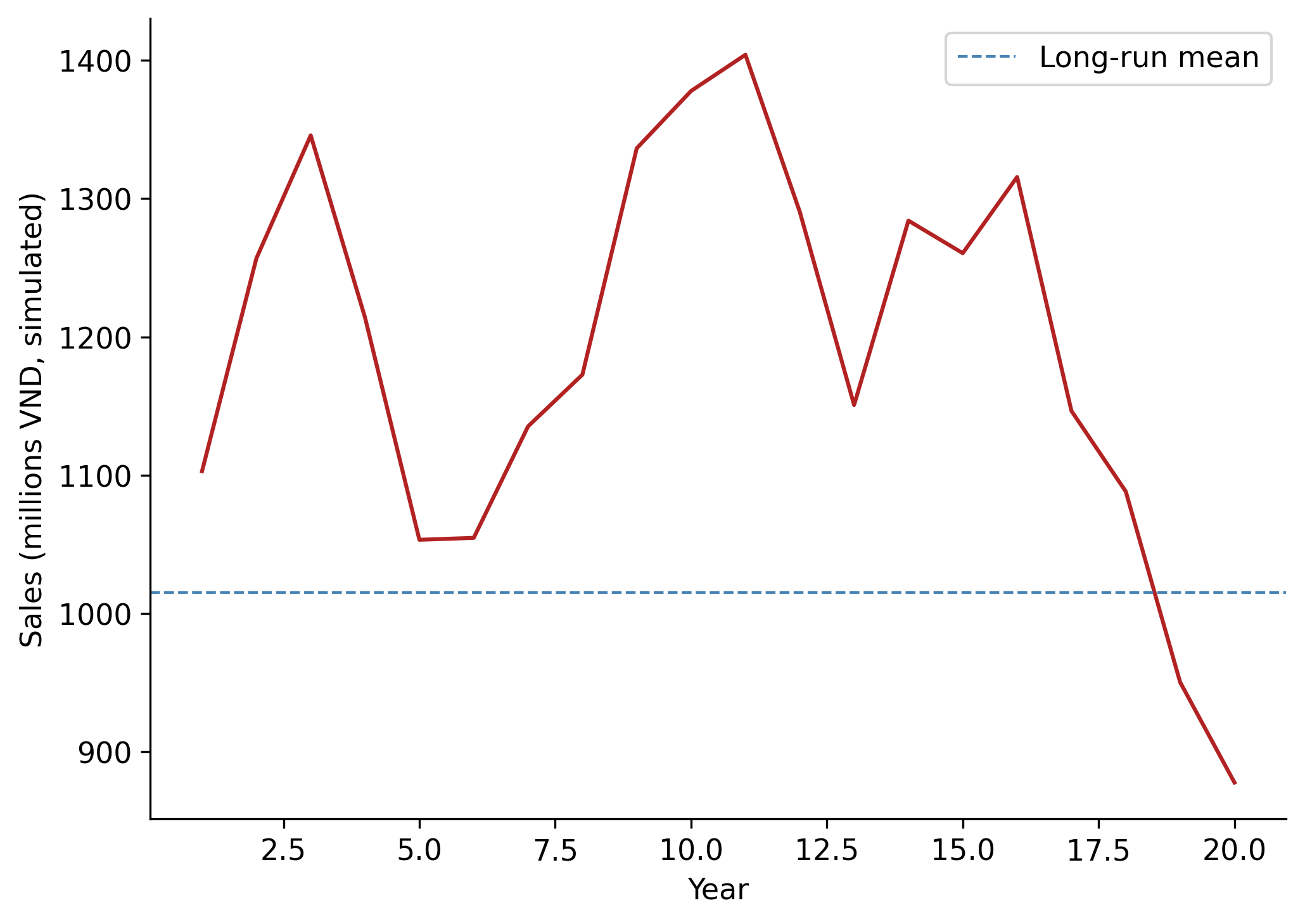 - Follows an AR(1) sales process: \(S_t = \bar{S} + \rho(S_{t-1} - \bar{S}) + \varepsilon_t\), where \(\varepsilon_t \sim N(0, \sigma^2_S)\)